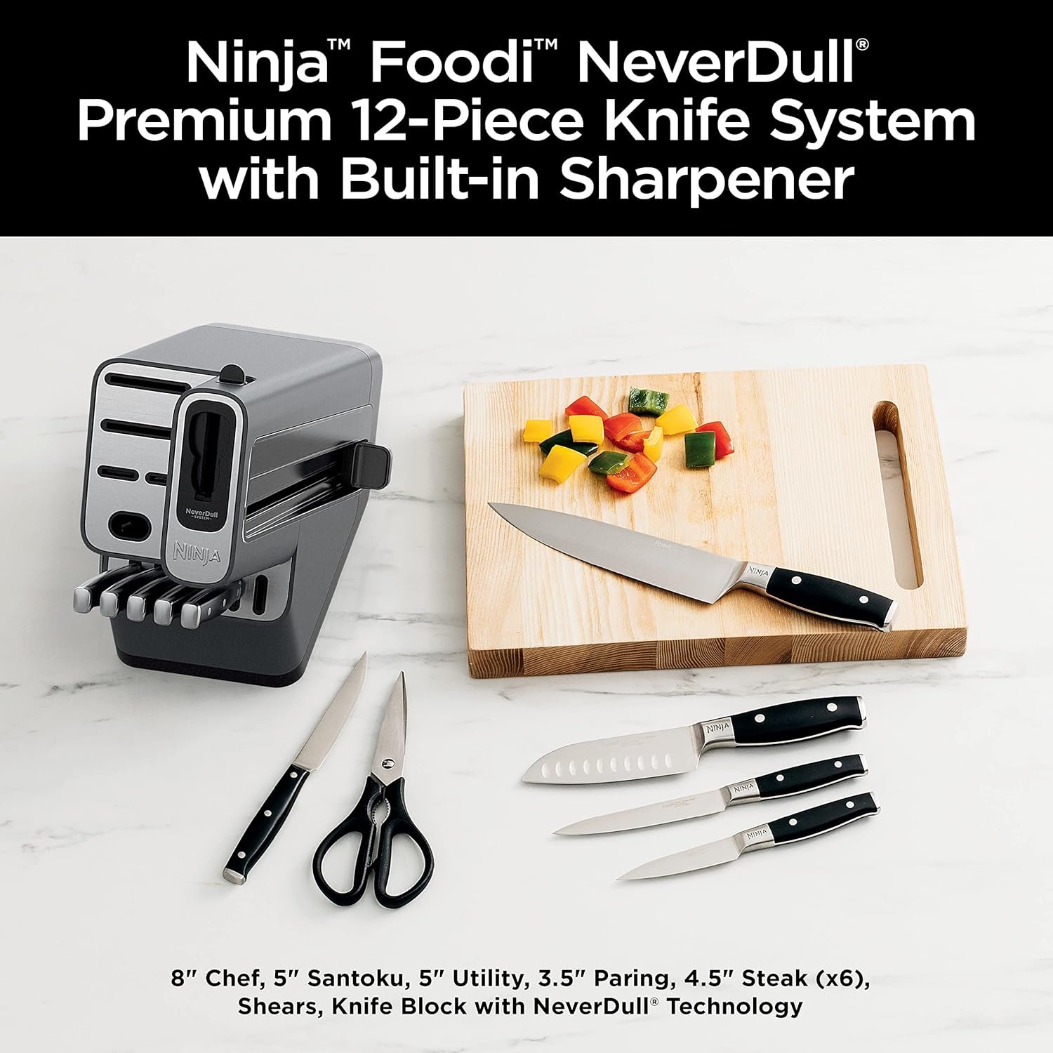- BUILT-IN SHARPENER: NeverDull Technology is conveniently built into the storage block for professional sharpening results that will maintain a razor-sharp edge for over 10 years!