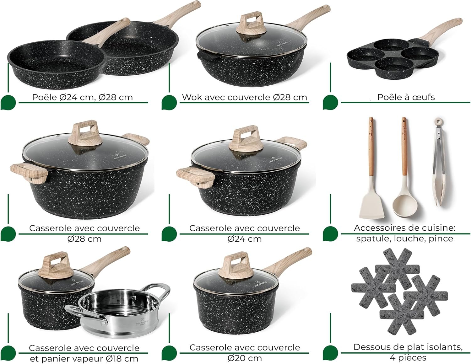 - Complete cookware set: incl-s 9.45 & 11 inch Non stick pots and pans set of 2*2 frying pans nonstick with lid, wokpan with lid 11 inch, egg pan, saucepan with lid and steamer 7 inch, saucepan with lid 6.3 inch, spatula, ladle, tongs, 4*pan protectors for all your cooking needs