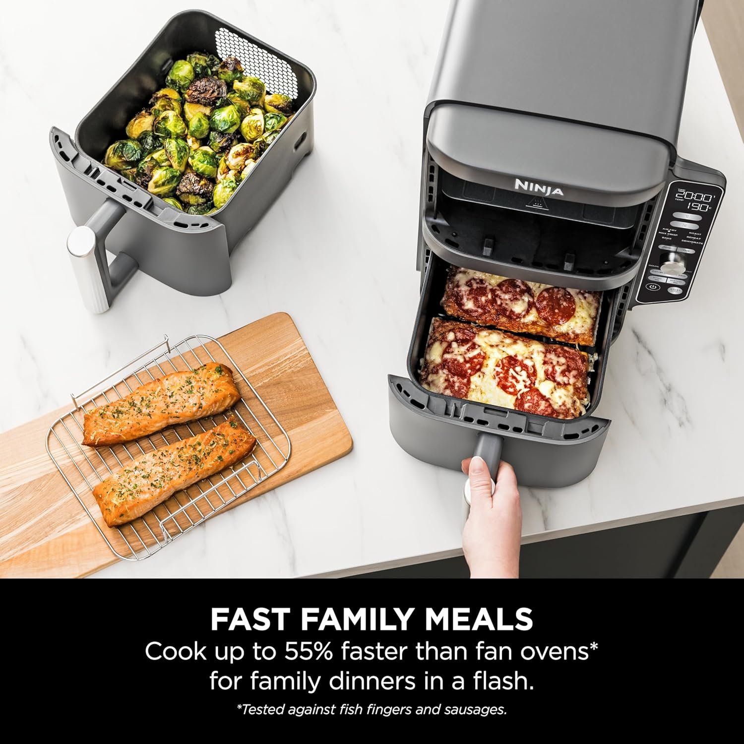 - 6 COOKING FUNCTIONS: Max Crisp, Air Fry, Roast, Bake, Reheat, Dehydrate. Up to 75% less fat* using the Air Fry function (Tested against deep fried, hand-cut French fries). SYNC & MATCH functions across 2 drawers.